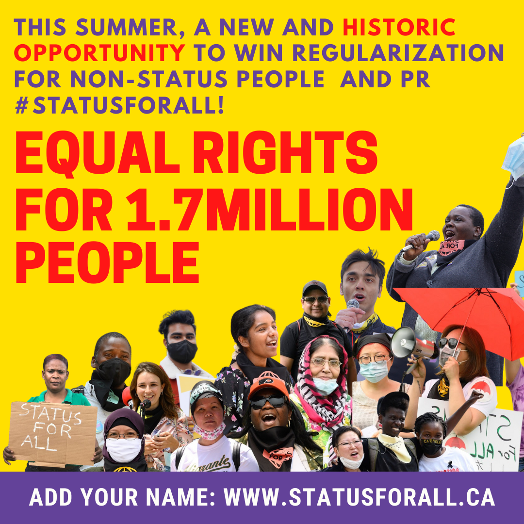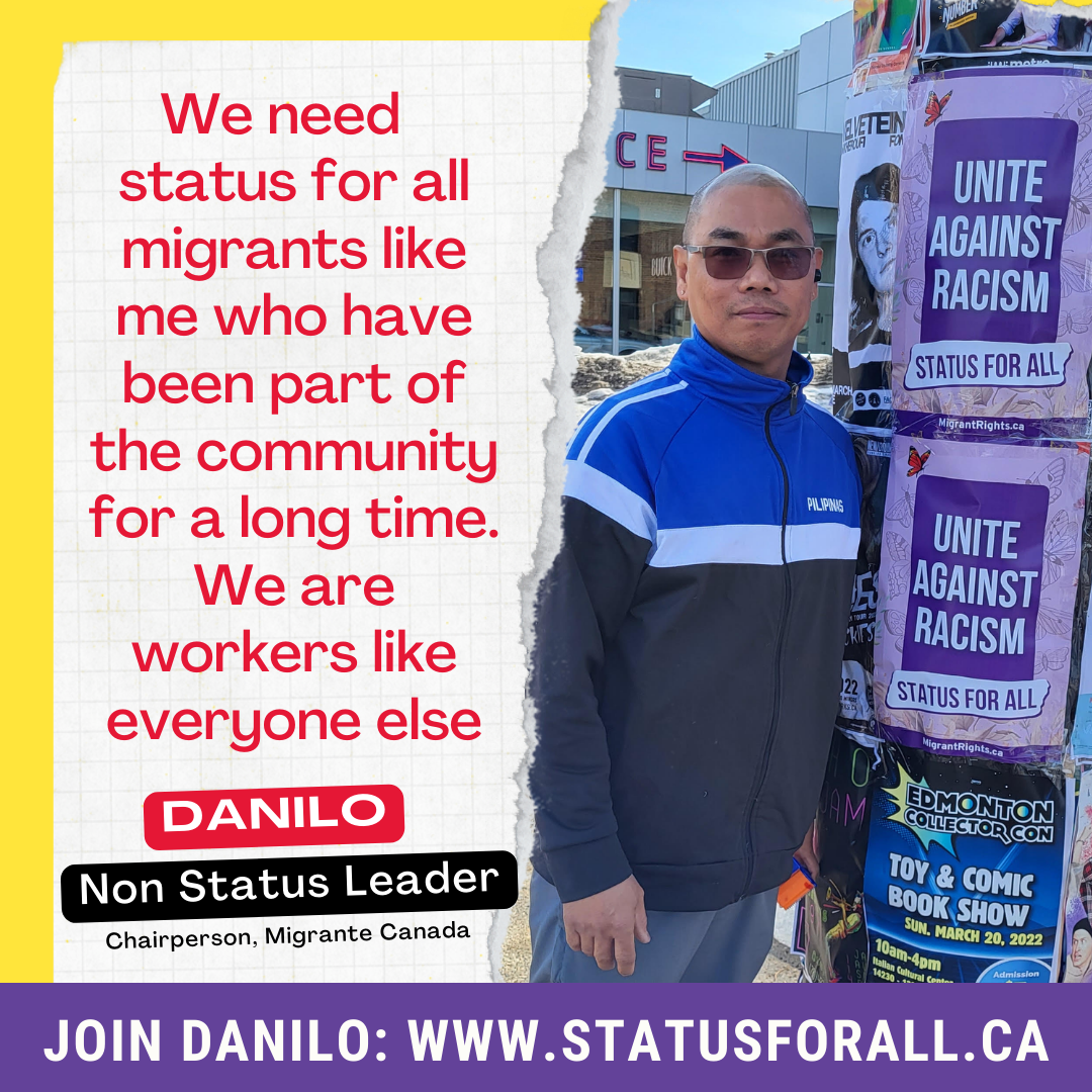 Tools and Resources MRN General Poster – 11×17 2022 Status for All Petition – letter size 2022 Status for All Petition – legal size MRN General Poster – letter size #StatusforAll – square image Social media: Danilo Social media: Blanca Policy Brief: Regularization in Canada Mise en Contexte: La rĂ©gularisation au Canada Sharing Petition Information with MRN Request for Support from Labour Movement Request for Support from Environmental & Climate Justice Organizations Request for Support – Civil Society Organizations Flyer Status for All – Letter Migrant Care Workers Flyer